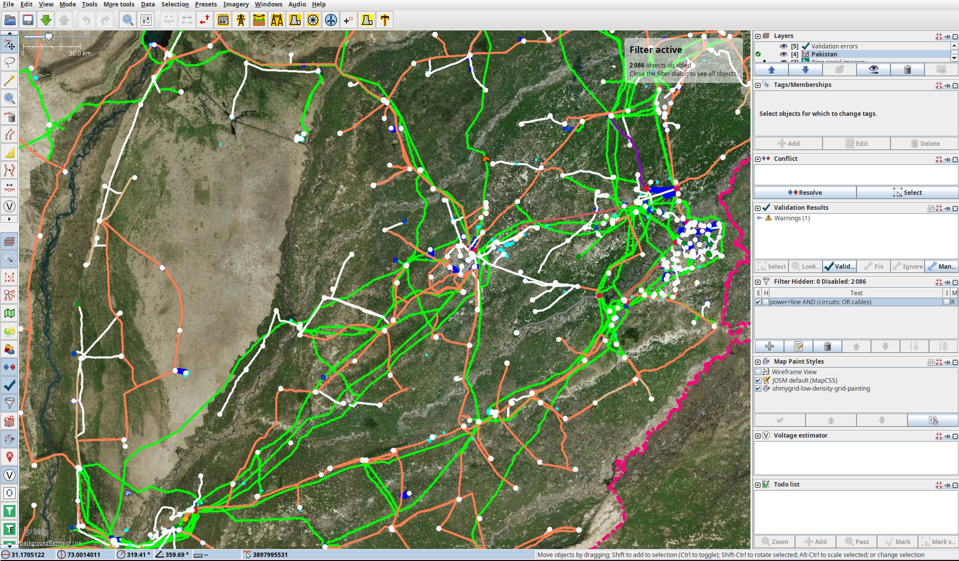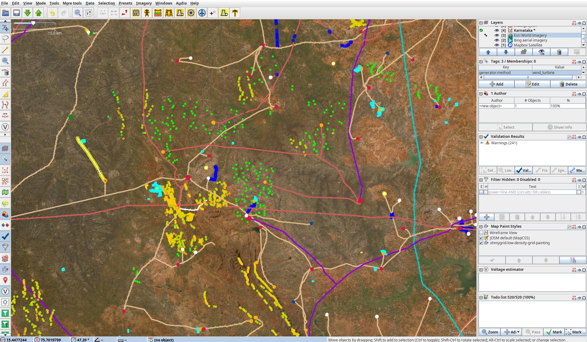 Default Transmission (50 kV+)in theTransmission Overpass Queryselected and download the tranmission grid data into another layer in JOSM. Activate this layer. - You can now step through all issues by pressing