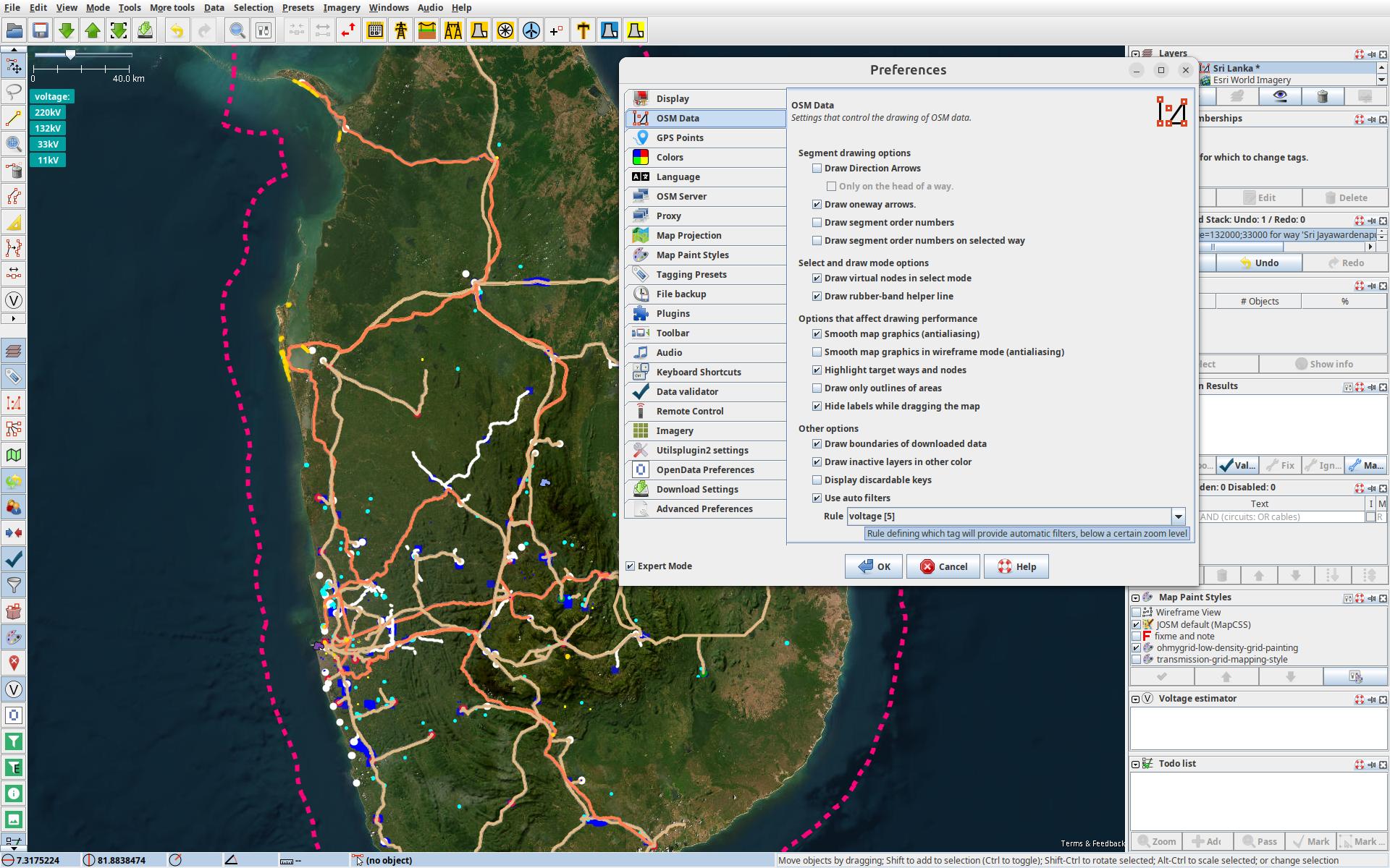 Custom map painting styles specific to power infrastructure make it easier to spot errors visually within JOSM. These styles highlight anomalies, such as disconnected segments or misclassified equipment, empowering mappers to perform visual audits in real time.